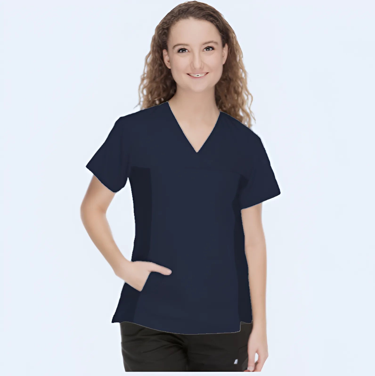One of our best-selling scrub tops, the Crossover, features stretch side panels for all-day comfort. It includes a divided pen pocket on the sleeve, two lower inset pockets, and a badge loop on the left chest for ID or instruments, enhancing its functionality.